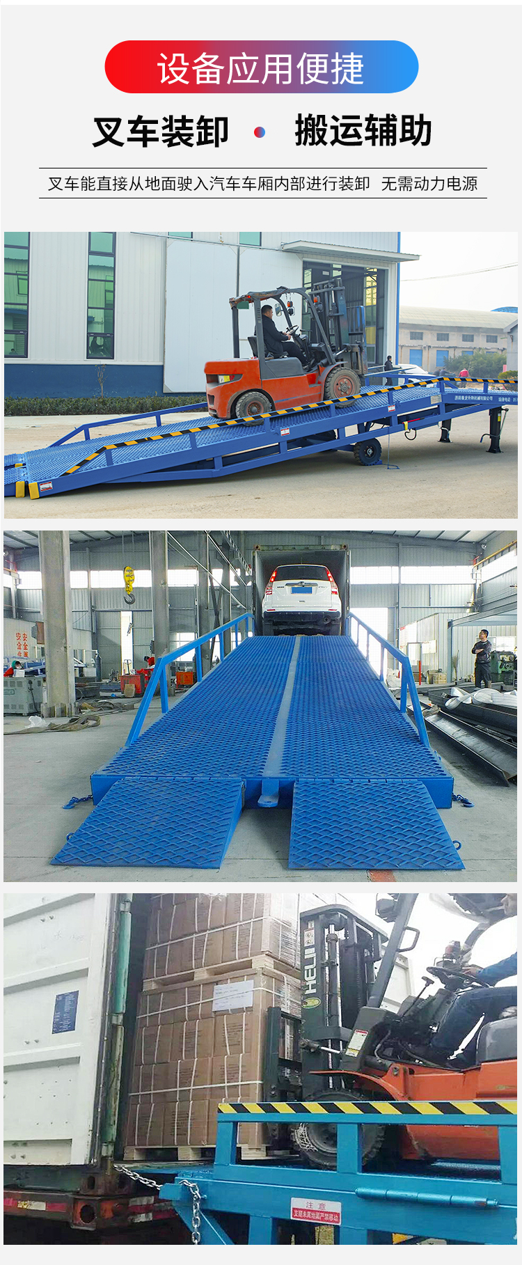 產(chǎn)品介紹:移動式液壓登車橋廣泛用于物流場所,是與叉車配合使用的貨物裝卸專用輔助設(shè)備,移動式液壓登車橋相當(dāng)于一個移動的鋼結(jié)構(gòu)斜坡,通過這個斜坡,叉車能直接從地面駛?cè)肫囓噹麅?nèi)部進(jìn)行批量裝卸作業(yè)。該液壓登車橋采用人工液壓動力,不需接動力電源。只需單人操作,即可實現(xiàn)貨物的安全快速裝卸。它可使您減少大量勞力,成倍提高裝卸作業(yè)效率,加快物料流通速度,獲取更大經(jīng)濟效益。