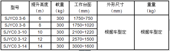 產(chǎn)品規(guī)格:車載式液壓升降平臺(tái)根據(jù)升降高度可分為:6、8、10、12、14米升降平臺(tái),設(shè)備載重300公斤至500公斤。客戶可根據(jù)需求選用解放、東風(fēng)、輕騎、福田、電瓶車等任何車型,設(shè)備直接采用汽車或電瓶的直接動(dòng)力升降。